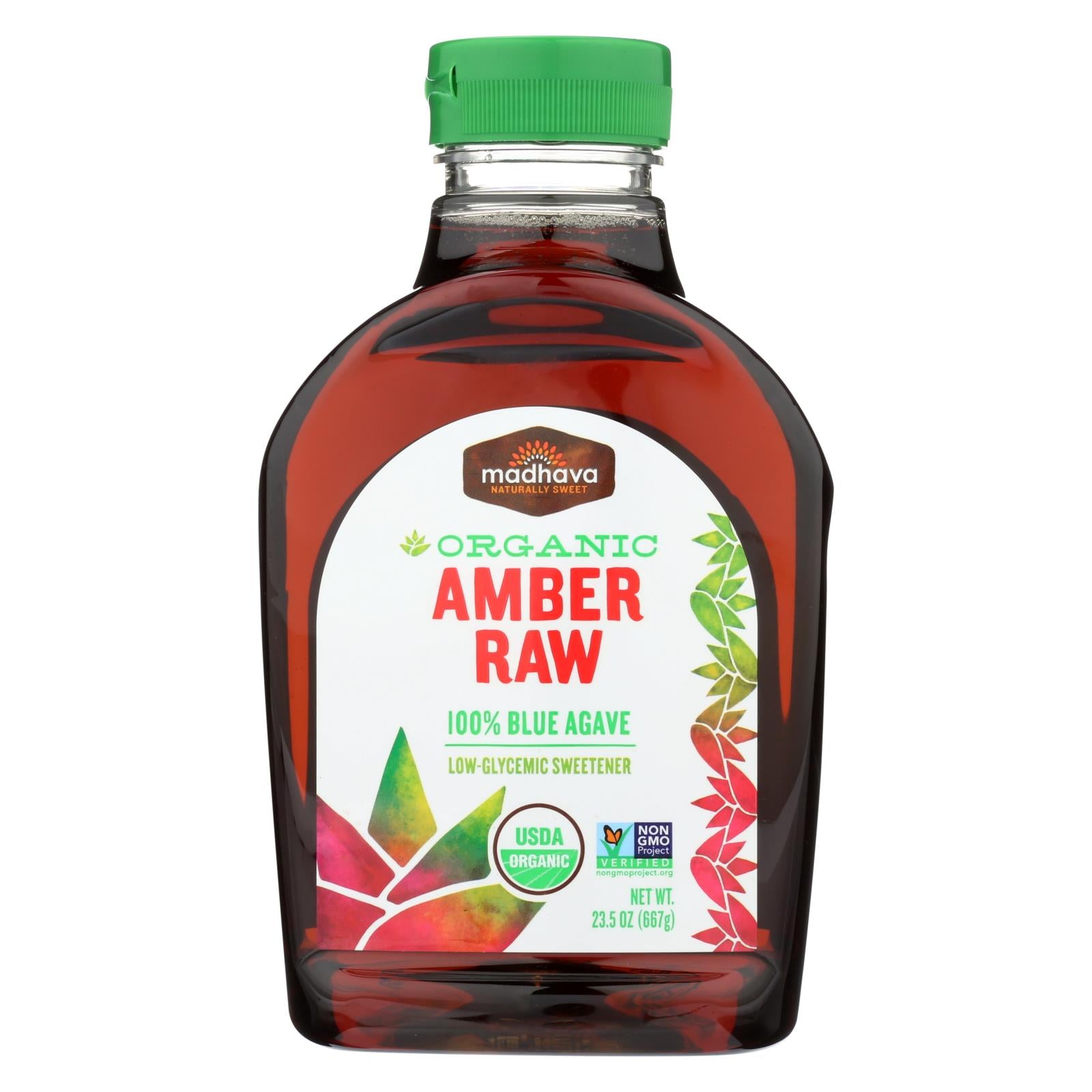 Madhava organic blue agave low-glycemic sweetener, amber raw, is an all-natural sugar replacement made from the juice of the agave plant. It’s a simple plant-based food that is a healthy alternative to processed sugar and artificial sweeteners. The amber raw variety has a rich, full flavor. This product is organic, gluten free, non-gmo, vegan and parve kosher. This bottle of madhava organic blue agave low-glycemic sweetener contains 23.5 oz. Of product. country of origin : united states is gmo free : yes is kosher : yes is vegan : yes organic : 95%+ organic size : 23.5 oz pack of : 6 selling unit : case ingredients : organic blue agave keywords : alternative;free;gluten;gmo;kosher;non;sugar;vegan