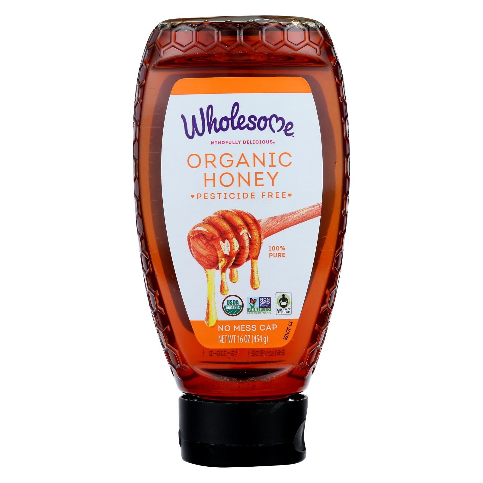 Wholesome! organic honey is certified non-gmo and fair trade. Our honey is naturally gluten-free and approved for kosher diets. This honey comes from bees that forage on organic wildflowers in protected forests. Use this honey in tea, on warm biscuits or with greek yogurt. This inverted squeeze bottle holds 16 oz. Of organic honey. country of origin : united states is gluten free : yes is gmo free : yes is fair trade item : yes is kosher : yes organic : 95%+ organic size : 16 oz pack of : 6 selling unit : case ingredients : organic honey keywords : agave;molasses;nectar;stevia;sugar;sweetener
