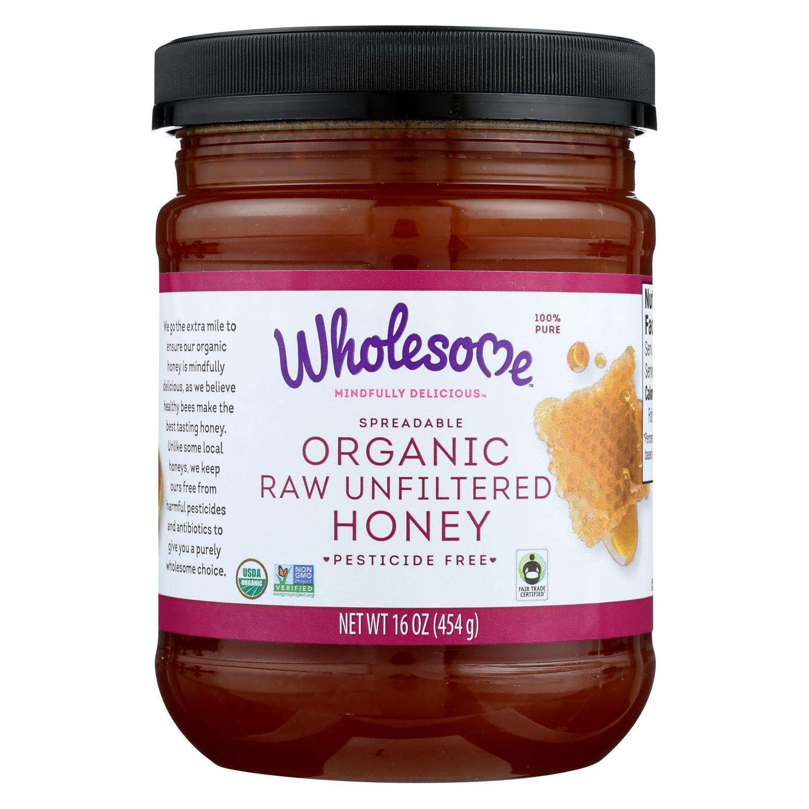 Wholesome! organic raw honey is certified non-gmo and fair trade. Our honey is naturally gluten-free and approved for kosher diets. This honey comes from bees that forage on organic wildflowers in protected forests. Use this honey in tea, on warm biscuits or with greek yogurt. This jar holds 16 oz. Of raw, organic honey. country of origin : united states is gluten free : yes is gmo free : yes is fair trade item : yes is kosher : yes organic : 95%+ organic size : 16 oz pack of : 6 selling unit : case ingredients : organic honey keywords : agave;molasses;nectar;stevia;sugar;sweetener