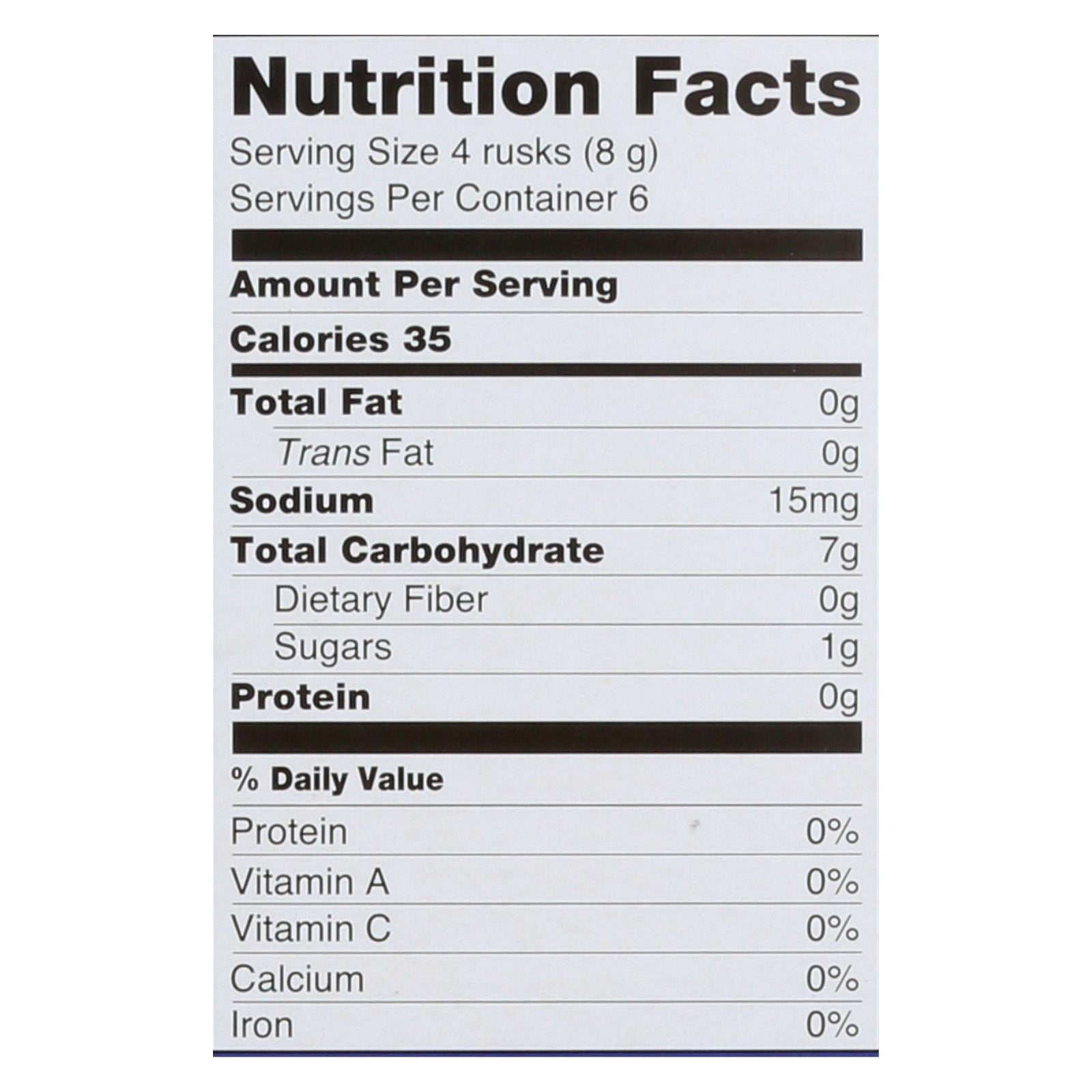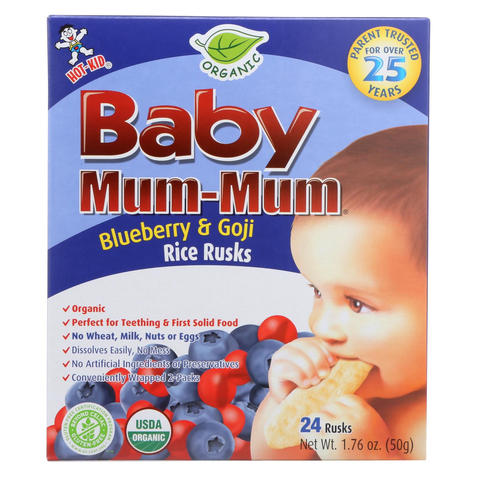 Baby mum mum organic baby teeth rice rusk, organic rice snack with blueberry and goji flavor are perfect for teething and first solid food. They are conveniently wrapped in 2-packs. These rusks dissolve easily. They are gluten-free and organic, so will contribute to your baby's good health. There are no artificial ingredients or preservatives, only organic rice flour, organic sugar, organic blueberry powder, organic goji powder and other natural ingredients. Each box contains 24 rusks. country of origin : china is gluten free : yes is gmo free : yes organic : 95%+ organic size : 1.76 oz pack of : 6 selling unit : case ingredients : organic rice flour;organic sugar;organic blueberry powder;blueberry powder;corn maltodextrin;purple carrot juice;organic goji powder;sea salt keywords : biscuit;first;food;free;gluten;sugar;teething