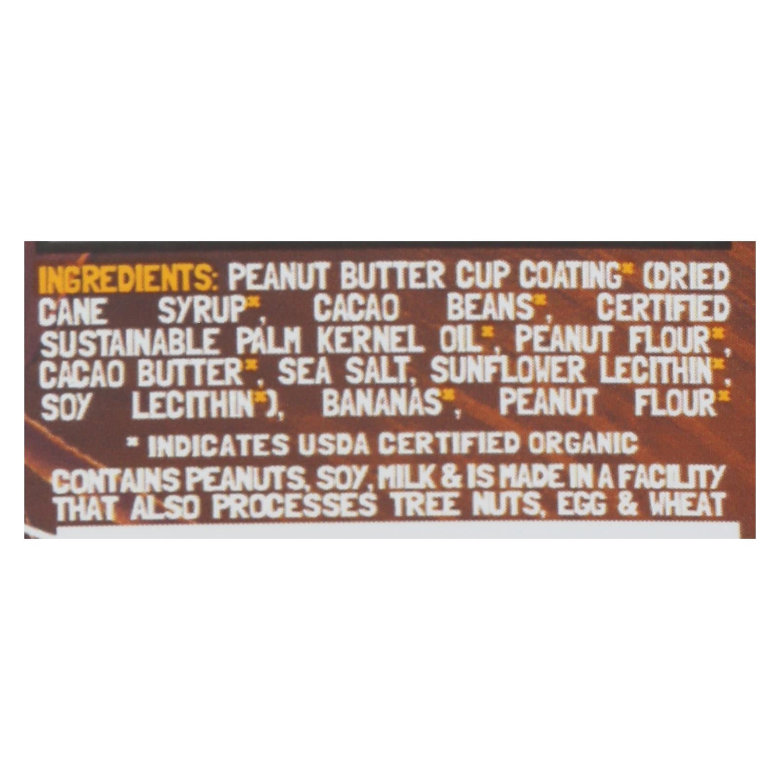 Barnana - ban bites chocolate pb cup - case of 12 - 3.5 oz country of origin : united states is gmo free : yes is kosher : yes organic : 95%+ organic size : 3.5 oz pack of : 12 selling unit : case ingredients : peanut butter cup coating;dried cane syrup;cacao beans;certified sustainable palm kernel oil;peanut flour;cacao butter;sea salt;sunflower lecithin;soy lecithin;bananas
